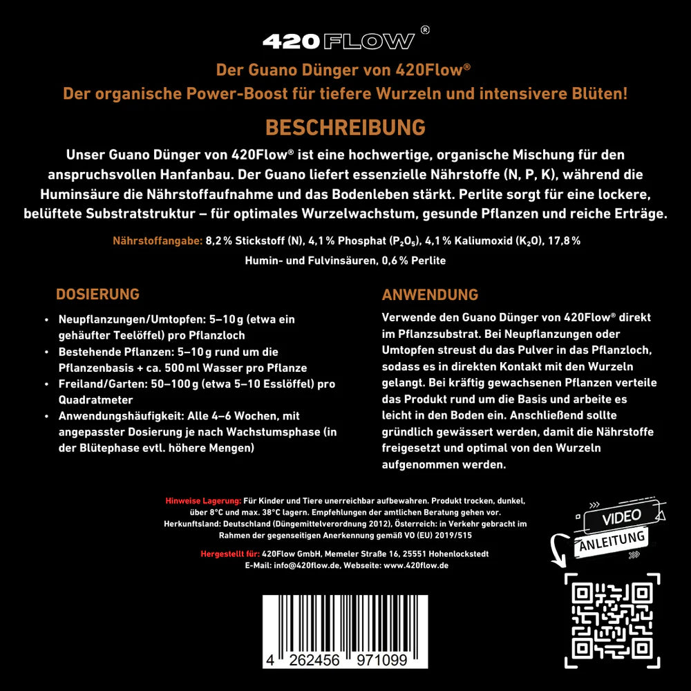 Der 420Flow® Guano Dünger ist ein natürlicher Kraftspender für Pflanzen, die starke Wurzeln, gesunde Struktur und intensive Blütenbildung benötigen. Das fein gemahlene Pulver enthält eine ausgewogene Mischung aus Stickstoff (N), Phosphor (P) und Kalium (K) – kombiniert mit Huminsäuren, Fulvinsäuren und Perlite.