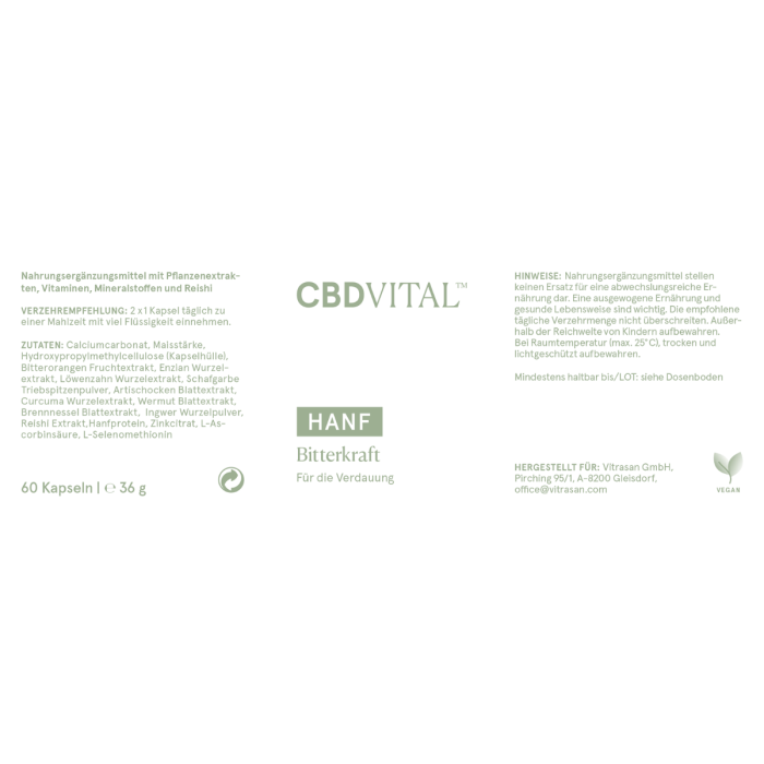 Zutaten: Calciumcarbonat, Maisstärke, Hydroxypropylmethylcellulose (Kapselhülle), Bitterorangen Fruchtextrakt, Enzian Wurzelextrakt, Löwenzahn Wurzelextrakt, Schafgarbe Triebspitzenpulver, Artischocken Blattextrakt, Curcuma Wurzelextrakt, Wermut Blattextrakt, Brennnessel Blattextrakt, Ingwer Wurzelextrakt, Reishi Extrakt, Cannabis Sativa Blattpulver, Zinkcitrat, L-Ascorbinsäure, L-Selenomethionin