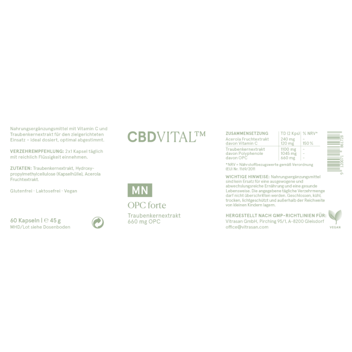Zutaten:Traubenkernextrakt, Hydroxypropylmethylcellulose (Kapselhülle), Acerola Fruchtextrakt.