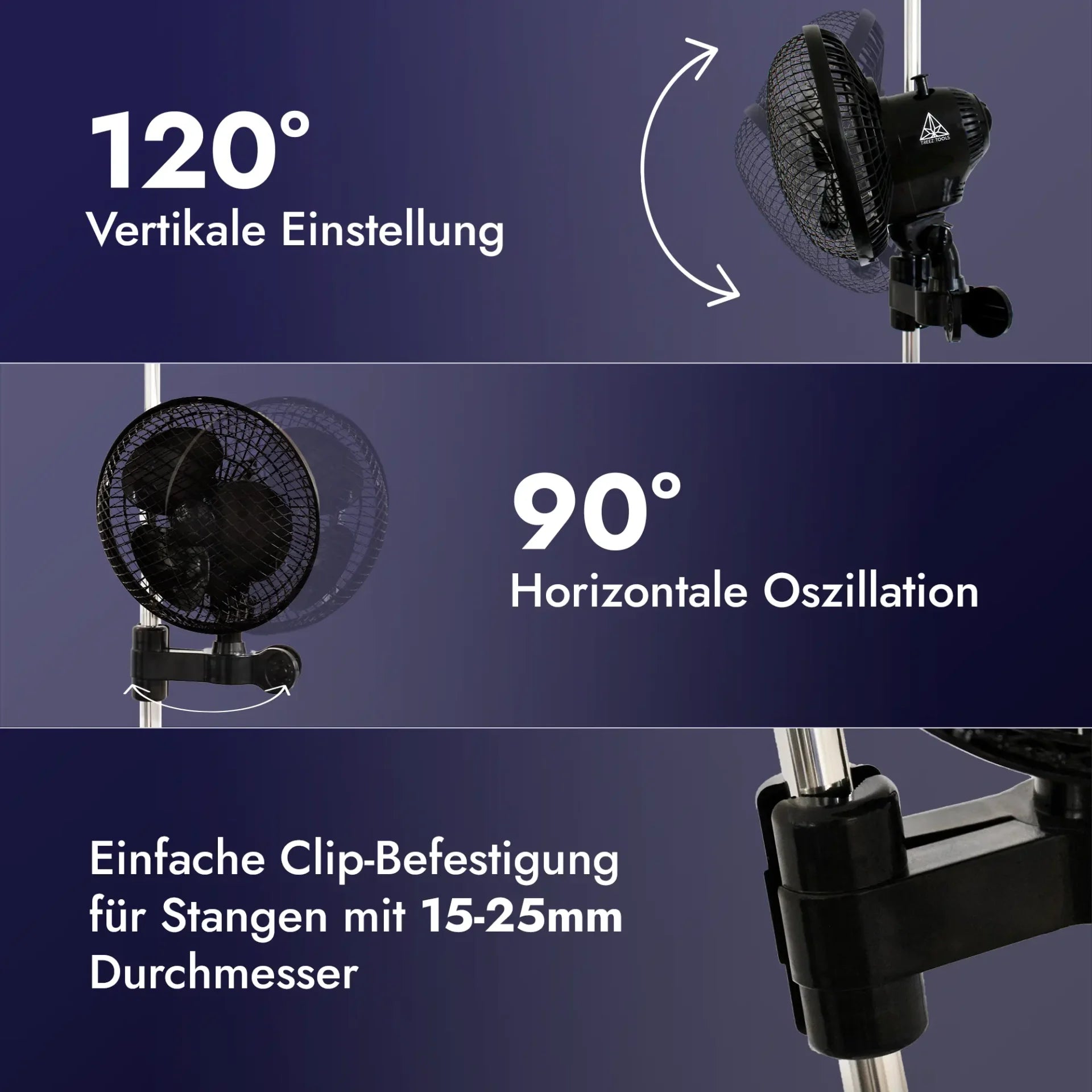 Durch die Höhenverstellbarkeit hast Du die Flexibilität, die Luftströmung individuell an die Bedürfnisse Deiner Pflanzen anzupassen. Ob Du frische Luft direkt auf die Blätter lenken möchtest oder eine gleichmäßige Verteilung der Luft im gesamten Zelt bevorzugst – der Ventilator macht es möglich.